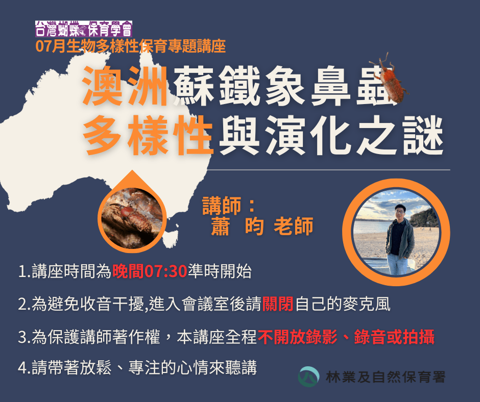 蘇鐵有別於一般的裸子植物,它們不以風為主要媒介進行授粉,而主要是由甲蟲來傳播花粉的。澳大利亞是全球蘇鐵多樣性中心之一,擁有接近90種已命名的蘇鐵物種,澳洲蘇鐵以象鼻蟲為主要授粉媒介。我們使用博物館標本收藏所保存的遺傳資訊,並結合形態特徵比對,來探討澳洲蘇鐵象鼻蟲的生物多樣性與演化生物學。剖析牠們有多少個物種,以及生態和演化上與蘇鐵交織的關係。
