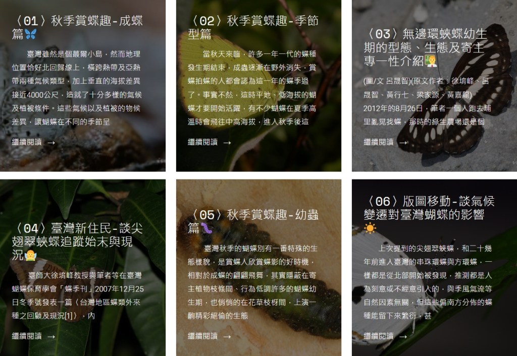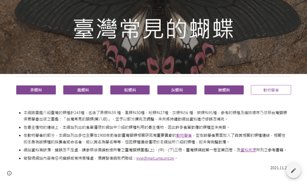 學習資源 【蝶蝶不休論文章專欄】 台灣蝴蝶圖鑑 蝴蝶辨識討論區 生態友站 政府單位資訊網 鱗翅目相關網站 生態保育團體 生態保育資訊 國家公園/國家森林遊樂區/國家風景區 植物解說牌 寄主植物 蜜源植物 蝶季刊