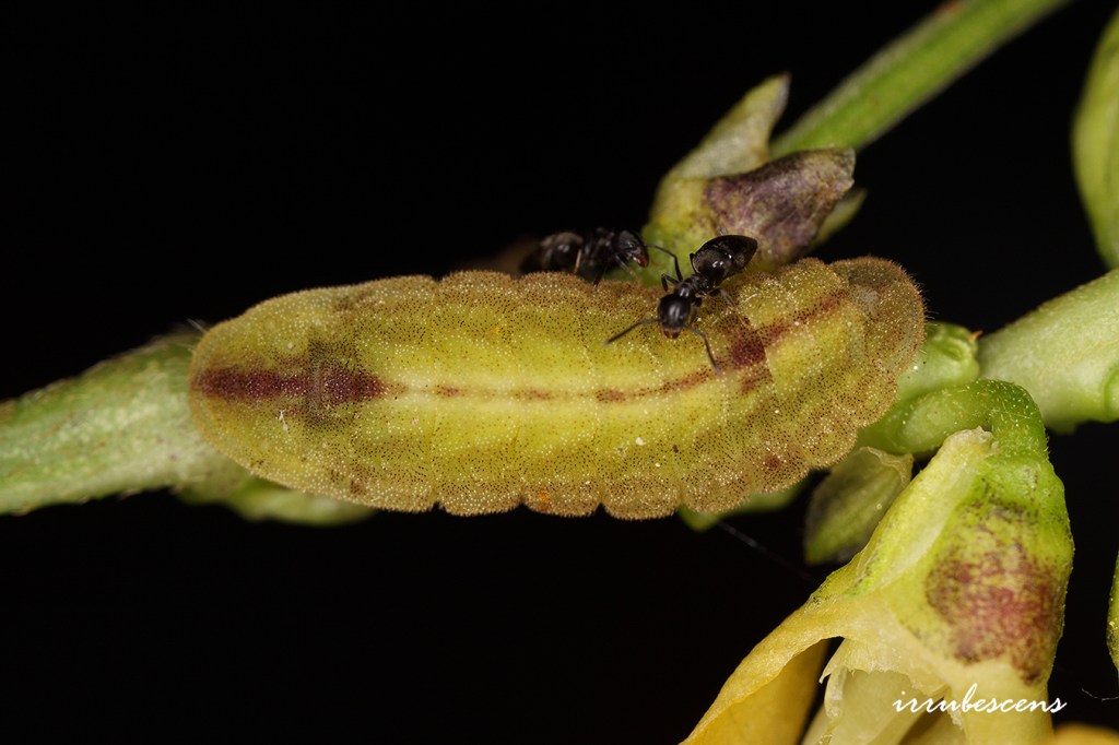 不僅偏好食果的蝴蝶幼蟲適合在秋季觀察,秋季有不少豆科植物綻放美麗的花朵,這也讓喜好取食豆科植物花朵的各式灰蝶有了豐沛的寄主植物,例如雅波灰蝶、豆波灰蝶、白雅波灰蝶、銀灰蝶等,都是探尋幼生期樣貌的好時機,以中南部常見的白雅波灰蝶為例,這種灰蝶的幼蟲喜好取食豇豆屬植物的花,在秋季這個大量豇豆開花的季節,很容易觀察到母蝶在寄主植物的花苞上認真產卵,藥錠狀的卵是白色帶點藍綠色澤,幼蟲則是美麗的綠色,有時身上會帶有紅色紋路,他們大啖花朵為食,為了避免花朵凋謝,食物供應不足,白雅波灰蝶的幼蟲能在短時間內迅速成長為終齡幼蟲,並下到地面落葉堆或其他隱蔽環境化蛹,假如有興趣飼養這些以豆科植物為食的灰蝶們,則要小心其幼蟲往往有吃掉其他幼蟲的習性,而且經常是已經成為前蛹的終齡幼蟲,由於行動不便,加上位於養殖容器內,無法躲藏,最容易被其他幼蟲吃掉。