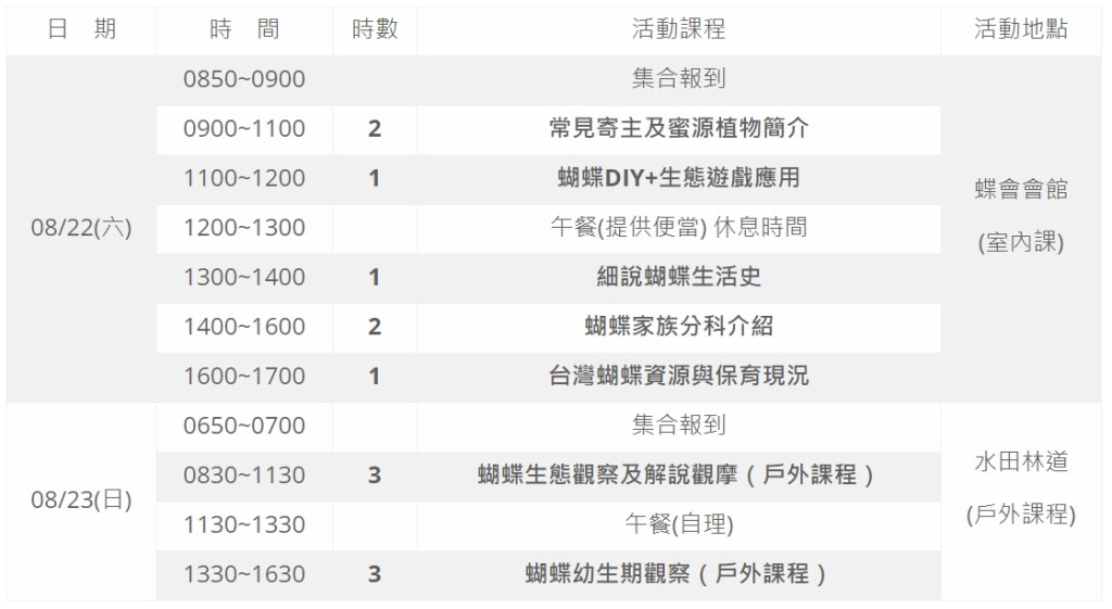 ☆研習對象:關心蝴蝶生態保育之社會大眾(需年滿18歲)及各級學校教師,共24個名額。(各級教師優先報名)