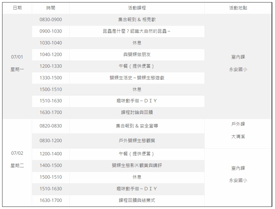 您正為孩子尋覓精采又有趣的夏令營嗎?趕快來報名2019蝴蝶保育夏令營,讓喜愛大自然的孩子一起學習蝴蝶知識,趣味動手做蝴蝶,引領親子們在浩瀚的自然野地裡探索蝴蝶的奧秘,激發孩子們無窮的想像力與觀察力,培養懂得體驗、享受及珍愛大自然的情感,不論是曼妙舞姿的蝴蝶仙子,或是充滿驚奇的昆蟲生態,皆會讓親子們留下難忘的學習體驗!
