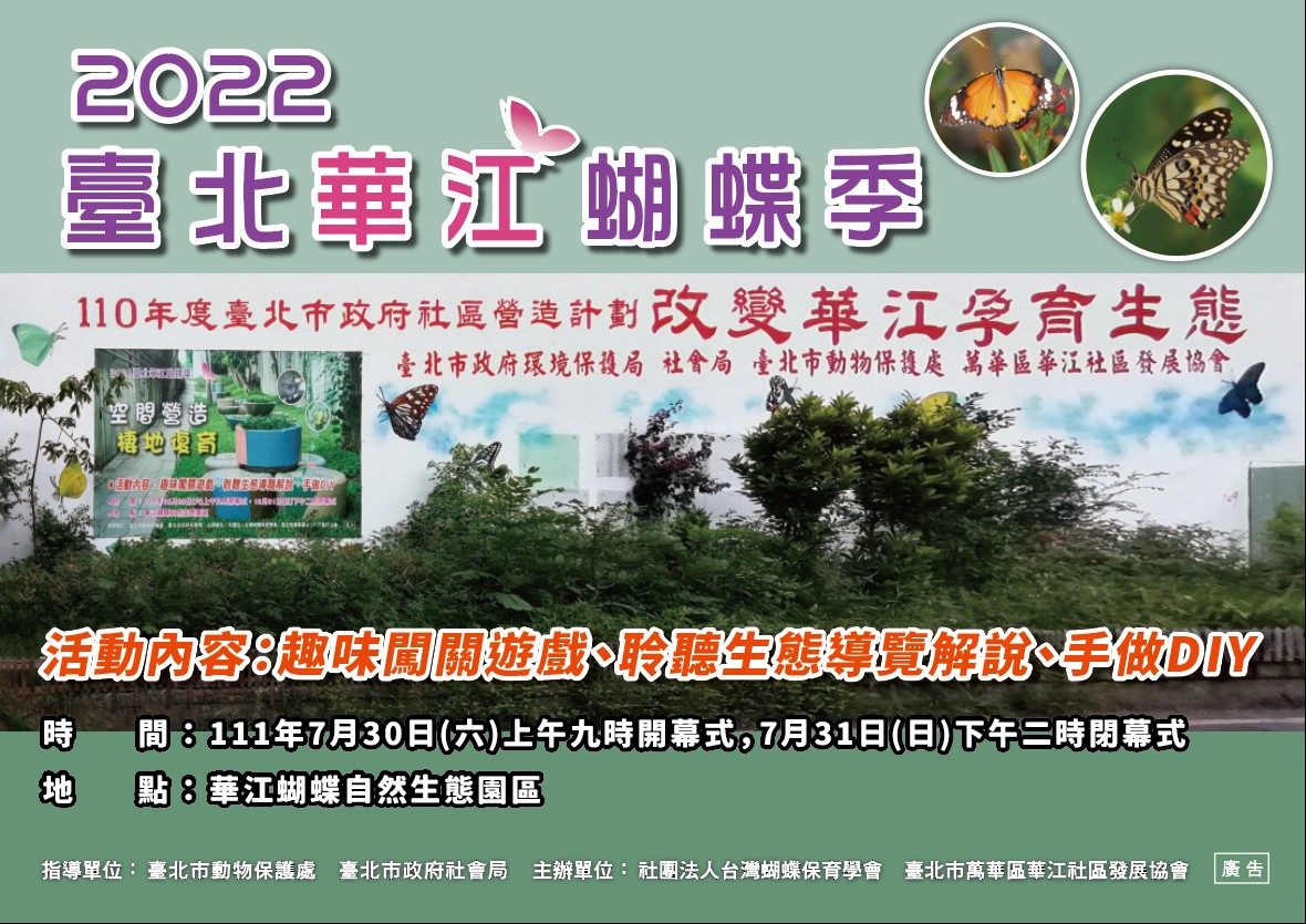 主辦單位:社團法人臺灣蝴蝶保育學會、臺北市萬華區華江社區發展協會