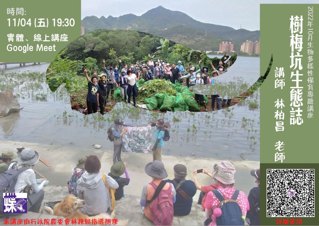 源自淡水小坪頂的樹梅坑溪於竹圍捷運站旁流入淡水河,原為無名的「大坑溝」近年因流經「樹梅坑」而得名,溪流雖不廣長卻為昔日在地居民灌溉、飲用的重要水源,然而隨著時空環境變遷,樹梅坑溪近十多年來蛻變不一樣形式延續精彩故事。2013年起,我與社區大學學員開啟了至今九年的生態踏查記錄工作,從河口上溯至源頭森林之濕地、住宅、農地、畜牧、野溪、埤塘、森林、水圳等多樣棲地環境,觀察記錄蝴蝶122種、蜻蛉22種、兩棲爬蟲31種、鳥類56種、魚蝦蟹類20種、哺乳動物10種生物,這是我們跟環境學習、反思、實踐的場域,本講座分享我們投入人與自然的生命故事。