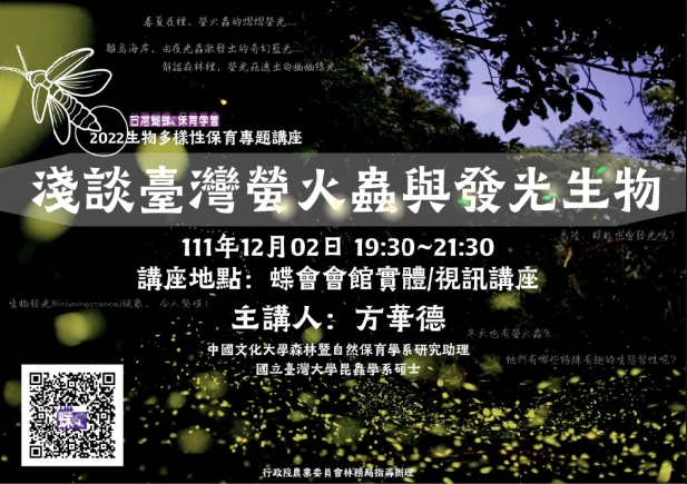 春夏夜裡,螢火蟲的熠熠螢光;離島海岸,由夜光蟲激發出的奇幻藍光;森林裡,螢光菇透出的幽幽綠光,這些由生物體產生的生物發光(Bioluminescence)現象, 充滿驚奇與令人嚮往。此外,您有看過馬陸、蜈蚣也會發光嗎?冬天也有螢火蟲?!其實臺灣的發光生物,遠比想像中的豐富,牠們有哪些特殊有趣的生態習性呢?將在講座中與大家呈現。