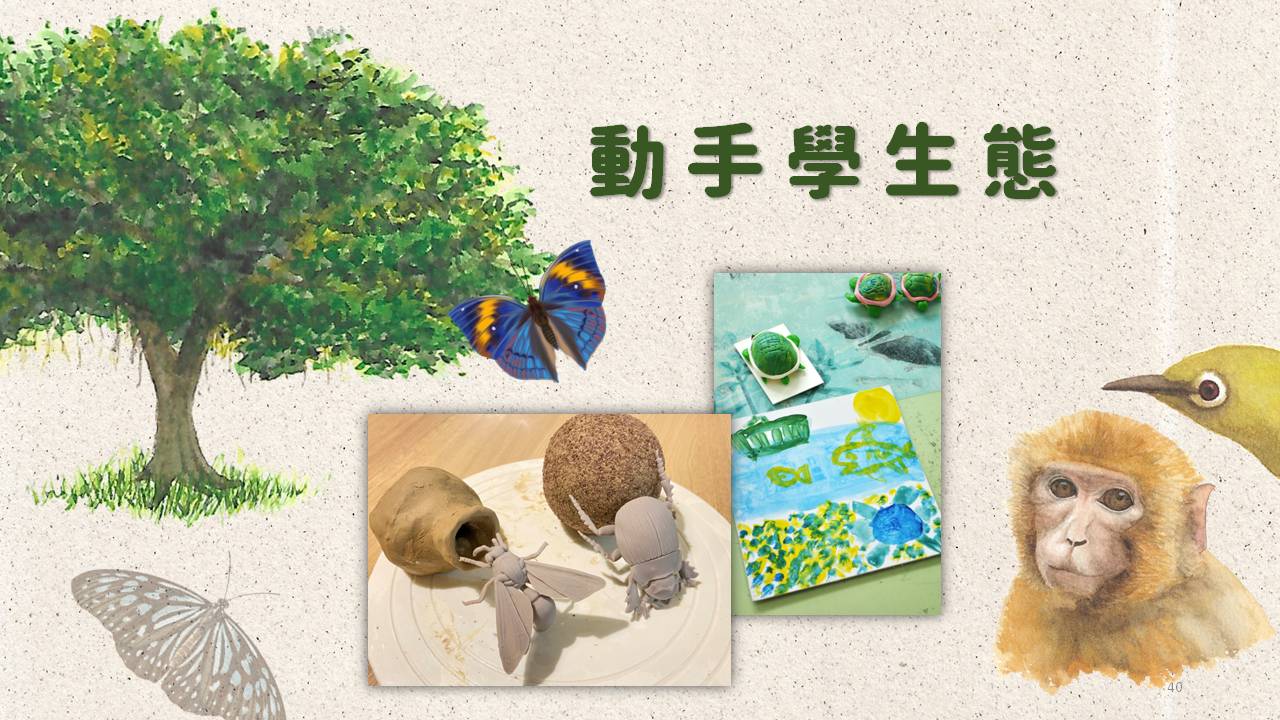 生態世界千變萬化、無奇不有,但是生物課、文獻資料卻讓人乏悶卻步…。將生態知識結合手作活動呈現,表現生態的趣味,以新奇有趣的手法表達動物之間的行為、自然環境的變化,讓學習者開心學習。創意手作活動的過程除了能引起學習興趣,更能加深學習印象。除了知識性的內容,也加入美感的創作體驗,兩者相輔相成,給予學習者趣味豐富的學習體驗。