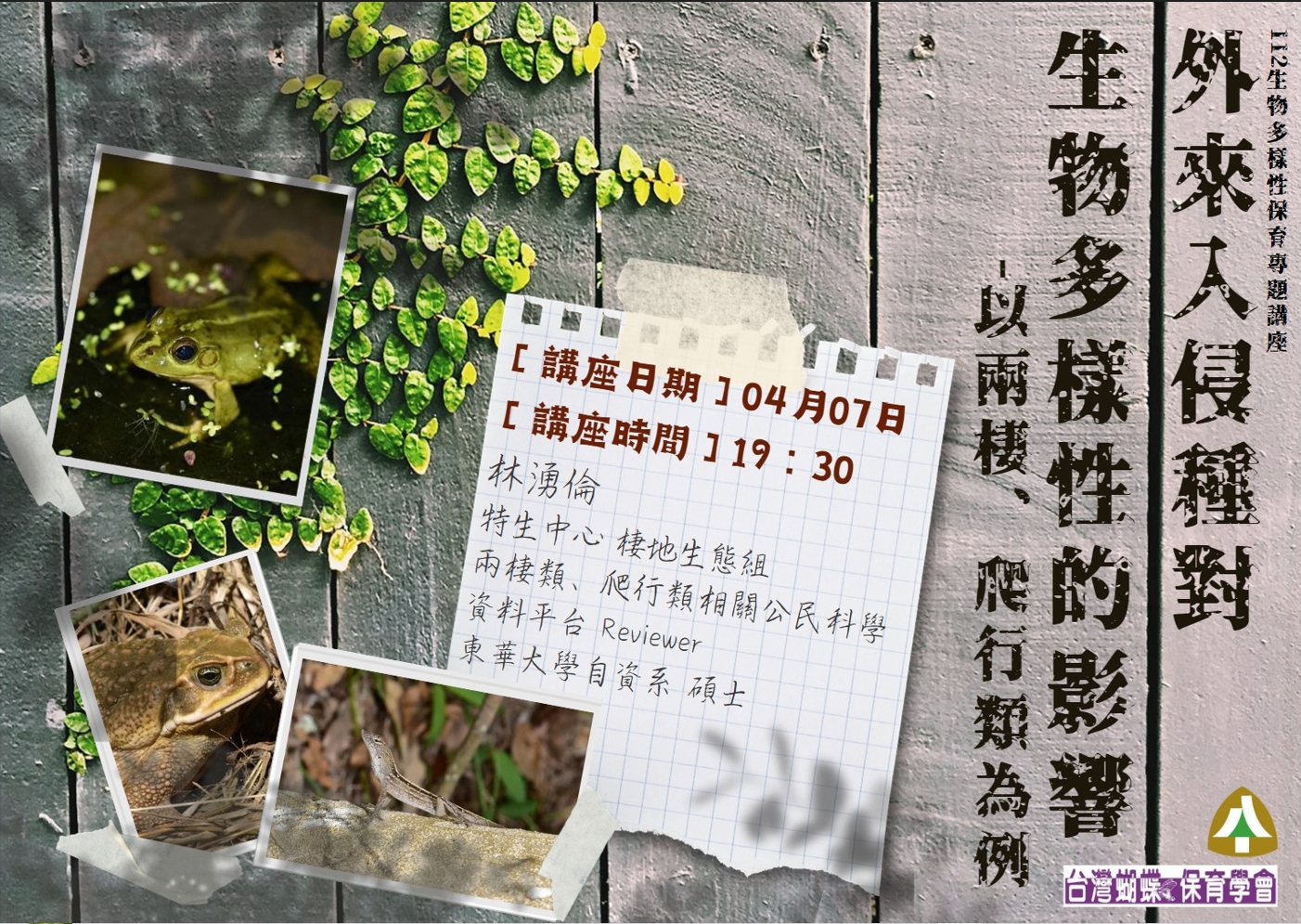 由世界的尺度來看臺灣,有人認為是個莞爾小島,但不可否認地,島上孕育著令人驚豔的生物多樣性,且許多物種是僅在福爾摩沙才能一睹風采的特有物種,而本講座將以兩棲、爬行動物的視角,來引領聽眾初步認識入侵種是什麼,進一步探究其對生物多樣性、經濟造成的影響,因而理解為何非要關注入侵種不可。第二部分,淺談現行主管機關針對入侵種管理的策略及規劃是什麼。最後,以臺灣的兩棲、爬行類的外來入侵種為案例(如,斑腿樹蛙、沙氏變色蜥及綠鬣蜥等),來審視對環境之影響。將以海蟾蜍的防治策略為例,來談面對外來入侵種正確防制的做法,結合眾人之力共同守護原生物種的家。