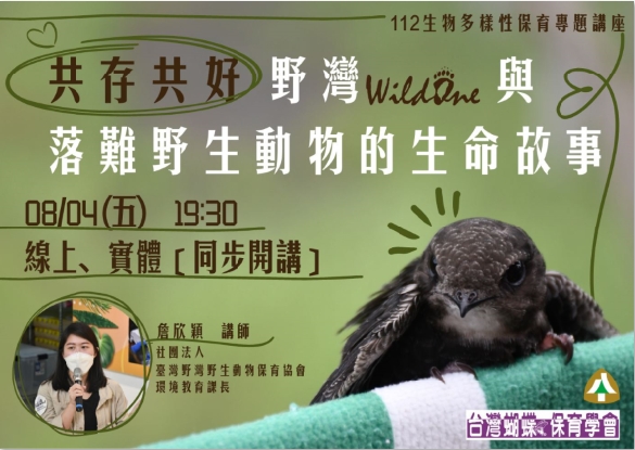 介紹野生動物救援工作內涵,分享印象深刻的救傷故事,包含鳳頭蒼鷹、黑熊、白鼻心、穿山甲、小雨燕等,認識野生動物面臨的生存危機,討論如何改變現況並學習參與保育工作。