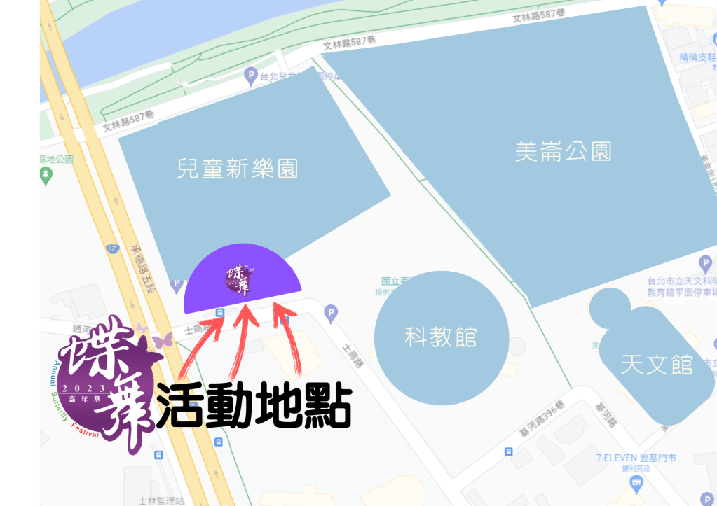 捷運士林站出口1→直行中正路,右轉基河路(距離約1.5公里)
