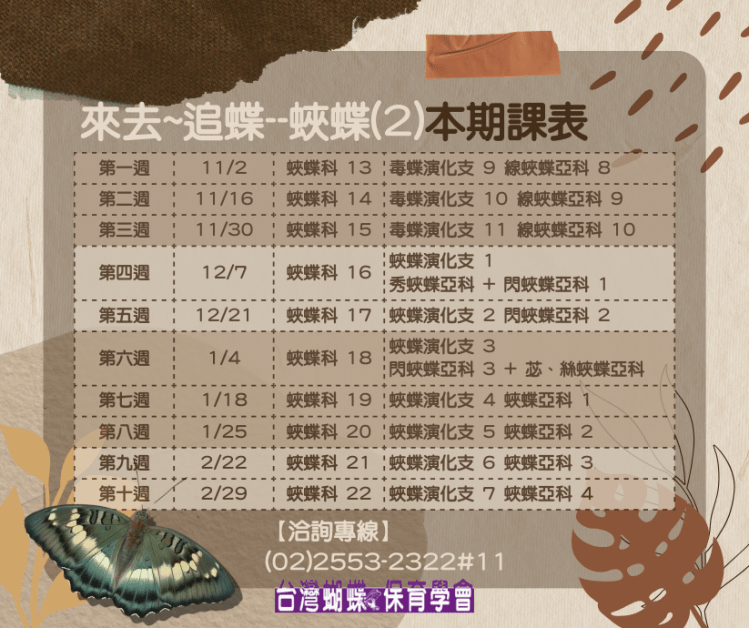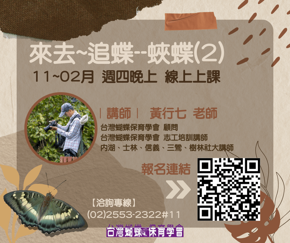 3.台灣蝴蝶保育學會精心規劃之研習課程,除了聘請該領域之專精名師授課,知性、感性與深度兼具外,更重要的意涵是活動盈餘全數轉為推動蝴蝶生態保育工作基金,您的支持蝶會深深感謝。