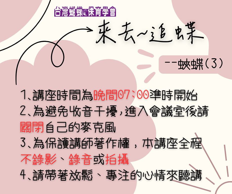 3.台灣蝴蝶保育學會精心規劃之研習課程,除了聘請該領域之專精名師授課,知性、感性與深度兼具外,更重要的意涵是活動盈餘全數轉為推動蝴蝶生態保育工作基金,您的支持蝶會深深感謝。