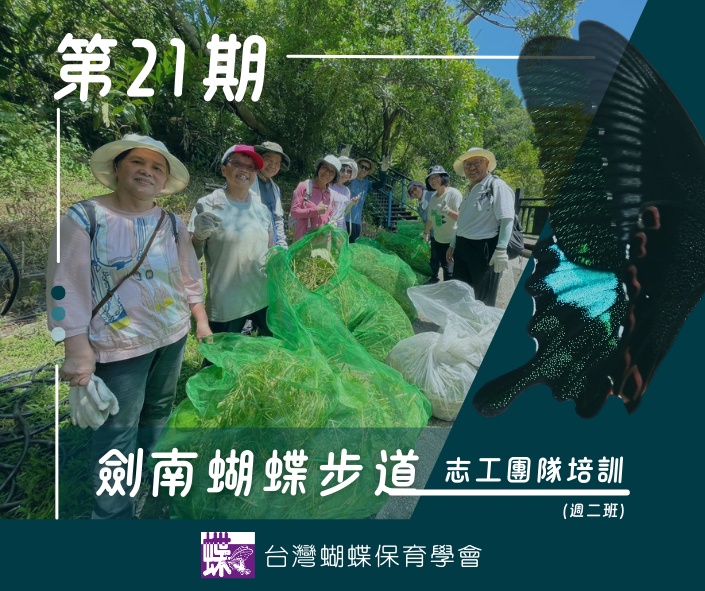 讓每位結訓的志工能於蝴蝶生態導覽解說活動中結合環境教育,傳達蝶會在劍南路及劍南蝶園的棲地經營理念及經驗,同時具備進行區域蝴蝶資源調查、棲地植栽養護、教育推廣、社區營造等工作之能力,並持續施以進階課程之教育訓練。