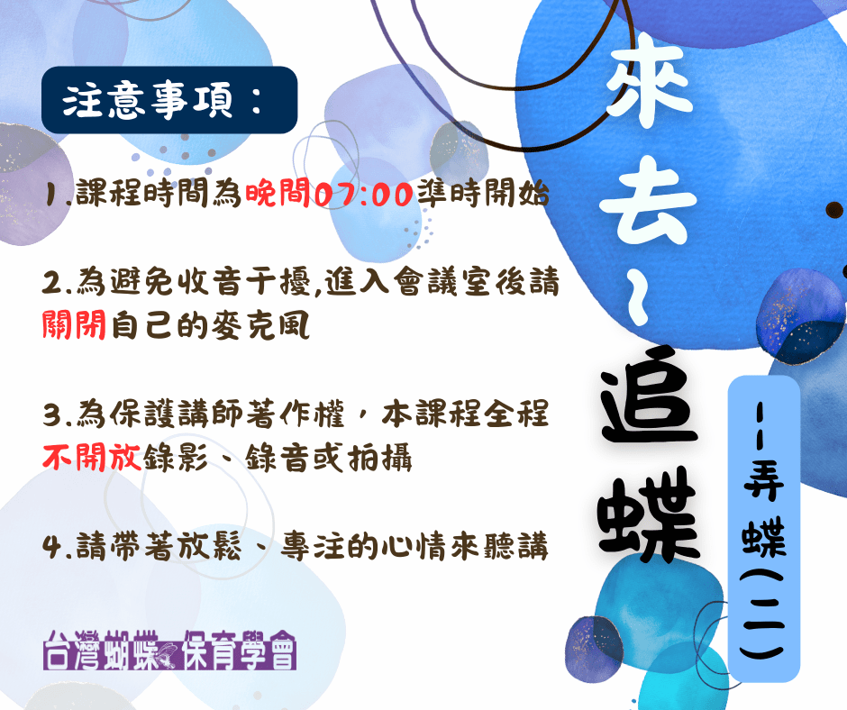 3.台灣蝴蝶保育學會精心規劃之研習課程,除了聘請該領域之專精名師授課,知性、感性與深度兼具外,更重要的意涵是活動盈餘全數轉為推動蝴蝶生態保育工作基金,您的支持蝶會深深感謝。