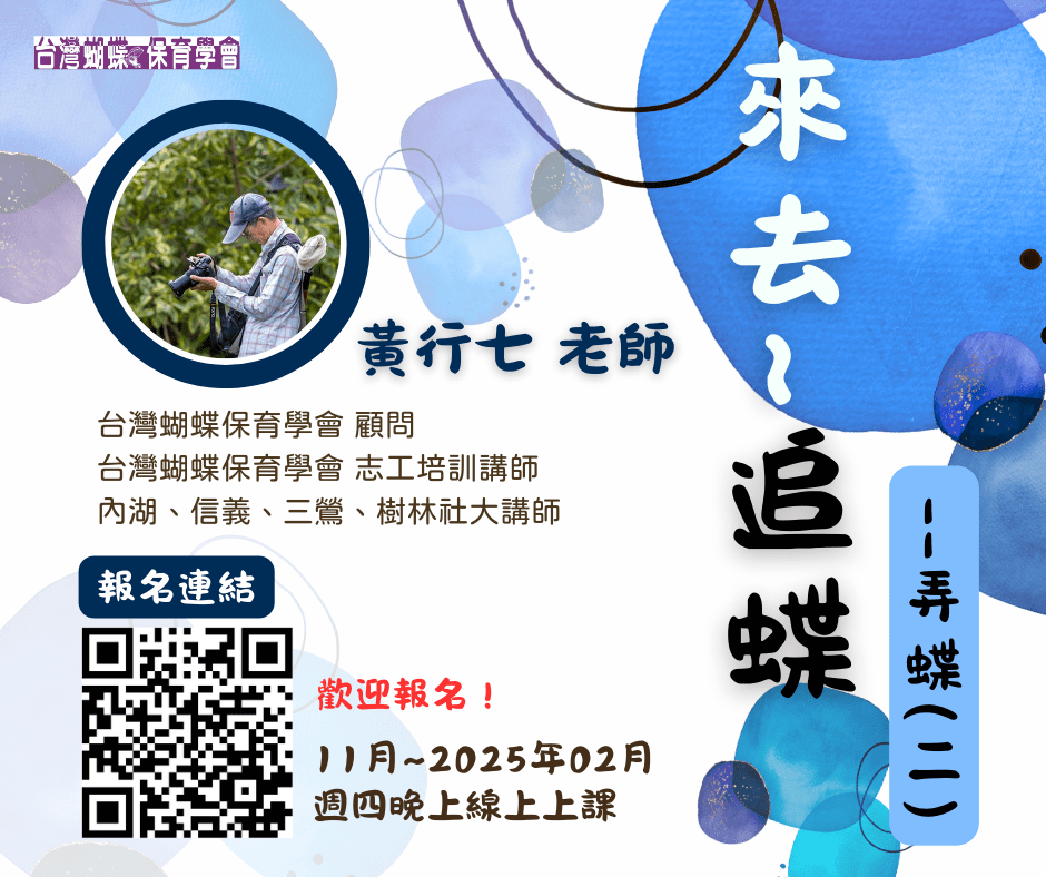 後疫情時代情蝶會開啟線上專題課程,經過前幾期〈鳳蝶〉、〈粉蝶〉、〈灰蝶〉、〈蛺蝶〉的一路陪伴後,讓我們繼續跟著關注蝴蝶生態40餘年的黃行七老師進入〈弄蝶〉的世界,一起與蝴蝶作朋友,走在蝴蝶最新資訊中~!
