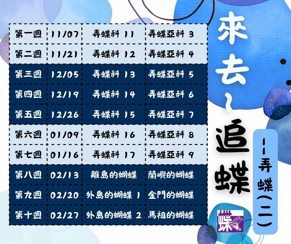 ※本期課程除弄蝶外,會再加上離島與外島的蝴蝶(詳見課表)