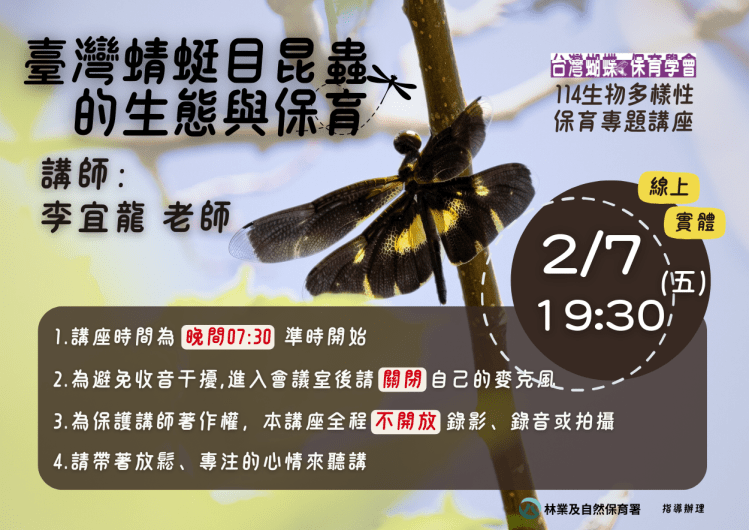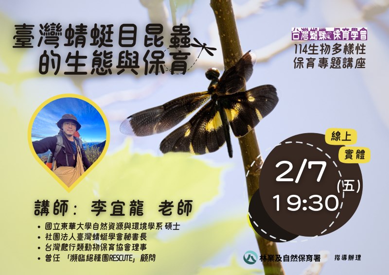 臺灣的蜻蜓目昆蟲紀錄有161種,目前可見的物種約有140種左右,其中不乏珍貴稀有的物種, 正遭遇生存危機。這次演講的主題為「臺灣蜻蜓目昆蟲的生態與保育」,主軸為介紹蜻蜓目昆蟲的生物學特性,以及蜻蜓與豆娘的生存與困境,希望大家能夠更認識臺灣蜻蜓目昆蟲及其生態以及保育課題,也讓大家認識臺灣蜻蜓學會的短中長期目標,希望大家能一起為蜻蜓甚至是昆蟲保育工作努力。