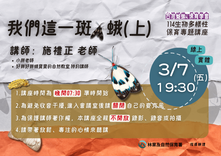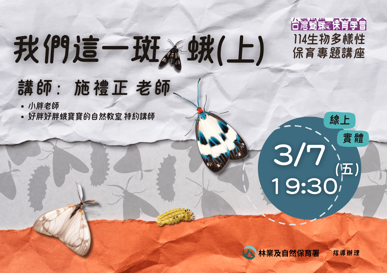 斑蛾是一群以日行性為主的蛾類,在臺灣已經記錄60種,約比弄蝶少一些。就像日行性的蝴蝶一樣,牠們也常常具有鮮豔的斑紋與顏色。但你以為斑蛾就只有外型美麗這個特色嗎?不論是形態特徵、生活史、擬態、防禦等,牠們都有著不同於蝴蝶的特色。本次演講將帶大家認識這群美麗的蛾類,並個別介紹螢斑蛾亞科螢斑蛾族各個種類。