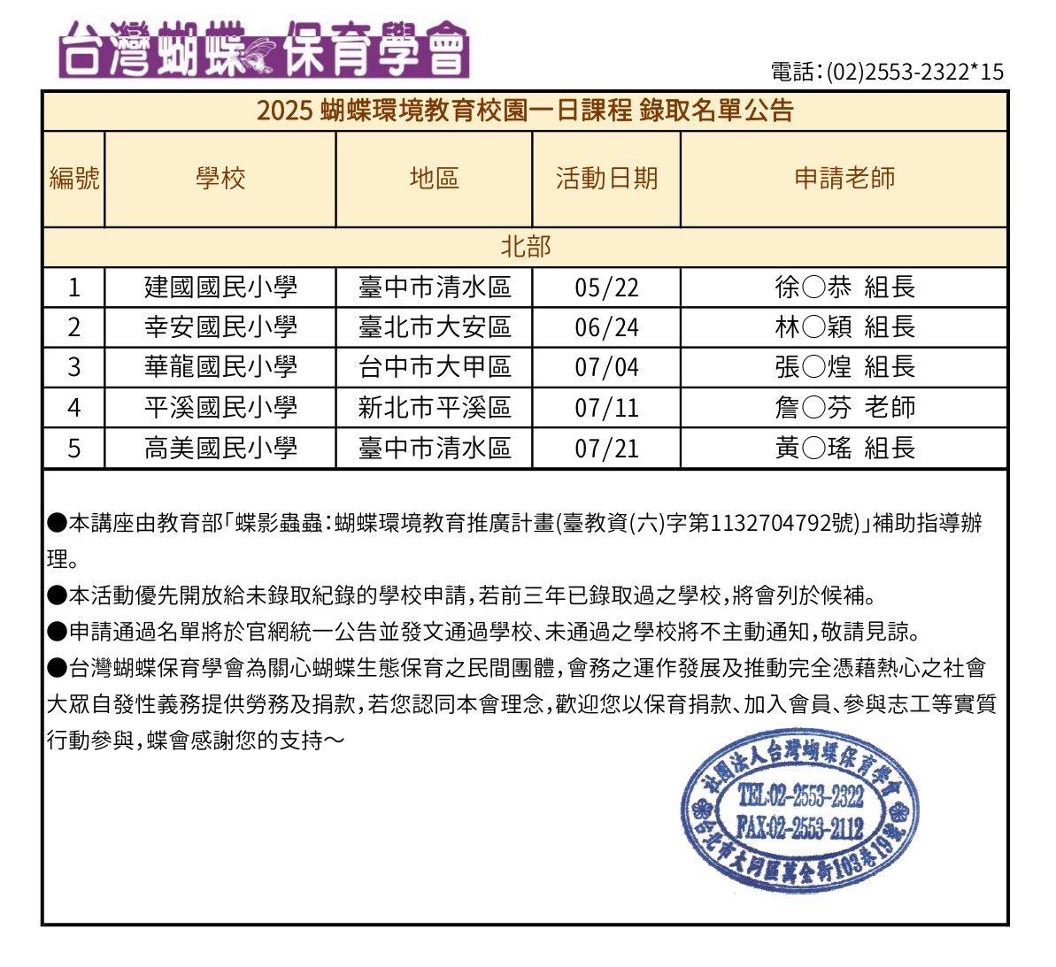 【公告】2025 蝴蝶環境教育校園一日課程 錄取名單 分類:台灣蝴蝶保育學會taiwanbutterfly2025 年 5 月 2 日2025 年 5 月 2 日發表於未分類標籤:最新消息 ※本課程申請已於04/30截止,共計8所學校申請,錄取5所。 分享此文: 按一下即可分享至 X(在新視窗中開啟) X 按一下以分享至 Facebook(在新視窗中開啟) Facebook 喜歡 正在載入... 相關