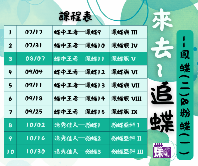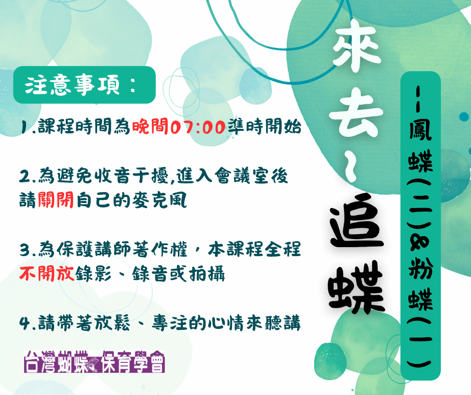 3.台灣蝴蝶保育學會精心規劃之研習課程,除了聘請該領域之專精名師授課,知性、感性與深度兼具外,更重要的意涵是活動盈餘全數轉為推動蝴蝶生態保育工作基金,您的支持蝶會深深感謝。