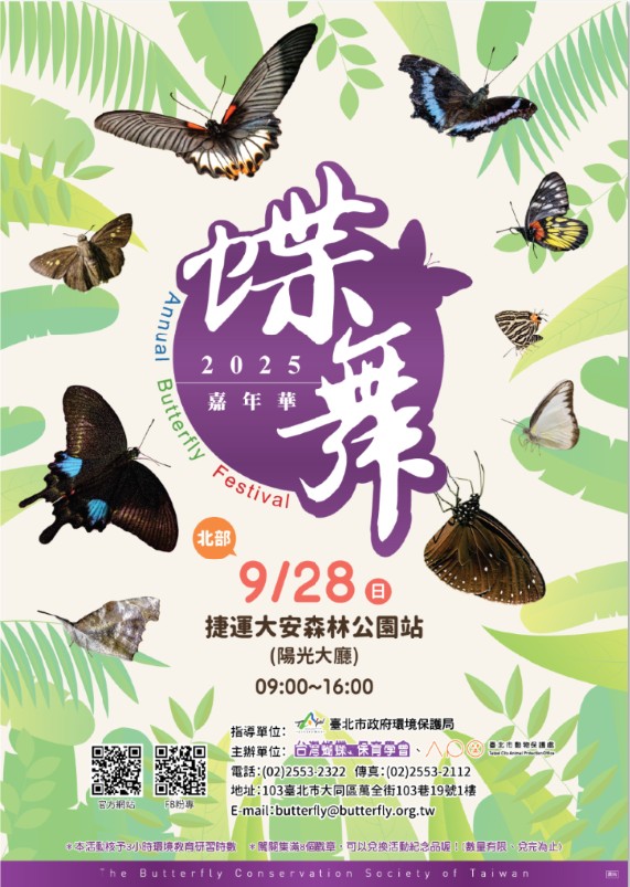 |2025蝶舞嘉年華|–北部場 分類:台灣蝴蝶保育學會taiwanbutterfly2025 年 7 月 30 日2025 年 8 月 2 日發表於蝶舞嘉年華,最新消息標籤:蝶舞嘉年華,最新消息 蝶會一年一度的大型活動–蝶舞嘉年華登場啦!當天會有有趣的闖關活動跟小遊戲,還有近距離蝴蝶觀察等等有趣的體驗!全部闖關完成就能兌換小禮物喔😍😍😍 ✨活動日期:09/28(日)09:00~16:00 ✨活動地點:捷運大安森林公園站(陽光大廳) ✨交通方式: 捷運大安森林公園站(接近3號與4號出口) ※本活動闖關完成可以核發3小時環境教育研習時數 ※指導單位:臺北市政府環境保護局※主辦單位:社團法人台灣蝴蝶保育學會、臺北市動物保護處 分享此文: 按一下即可分享至 X(在新視窗中開啟) X 按一下以分享至 Facebook(在新視窗中開啟) Facebook 喜歡 正在載入... 相關