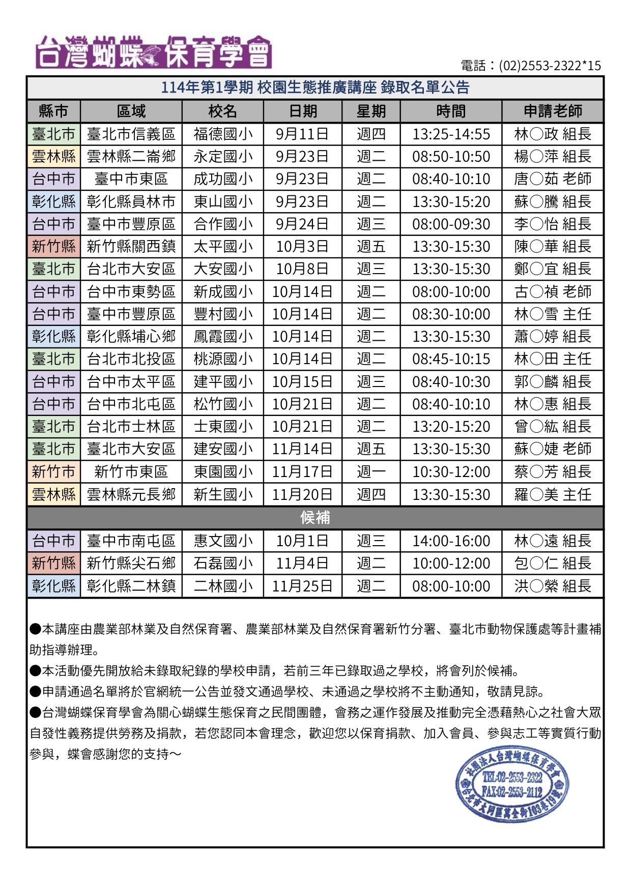 2025校園蝴蝶生態推廣講座(114-1)—申請通過學校 分類:台灣蝴蝶保育學會taiwanbutterfly2025 年 8 月 27 日2025 年 8 月 27 日發表於未分類標籤:最新消息 ※本會提供之2025免費蝴蝶生態推廣講座(114-1)已於08月19日截止申請,本次申請學校共計125所,經抽籤錄取17所正取學校,3所備取學校。 分享此文: 按一下即可分享至 X(在新視窗中開啟) X 按一下以分享至 Facebook(在新視窗中開啟) Facebook 喜歡 正在載入... 相關