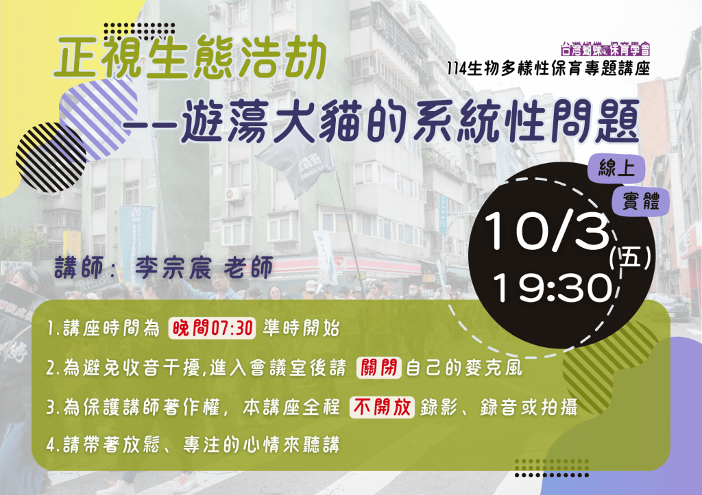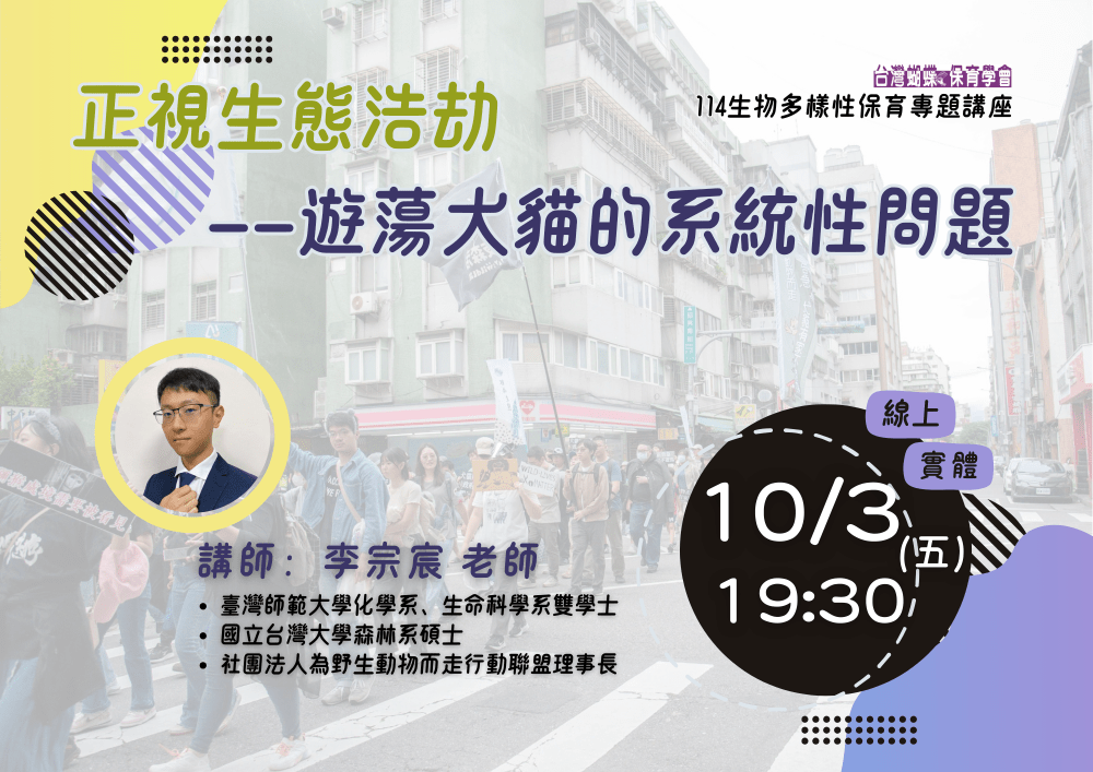 然而,現行政策長期縱容,使犬貓在野外持續繁衍,收容所因零安樂而周轉失靈,龐大資源也隨之錯置。這場演講將從科學數據、國際經驗與台灣政策落差出發,解析問題的結構性根源,並提出「以保育為本」的治理轉型路徑,呼籲社會正視這場正在發生的生態浩劫。