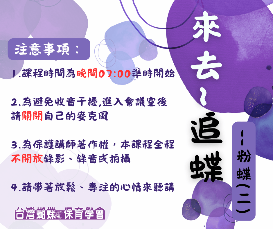 3.台灣蝴蝶保育學會精心規劃之研習課程,除了聘請該領域之專精名師授課,知性、感性與深度兼具外,更重要的意涵是活動盈餘全數轉為推動蝴蝶生態保育工作基金,您的支持蝶會深深感謝。