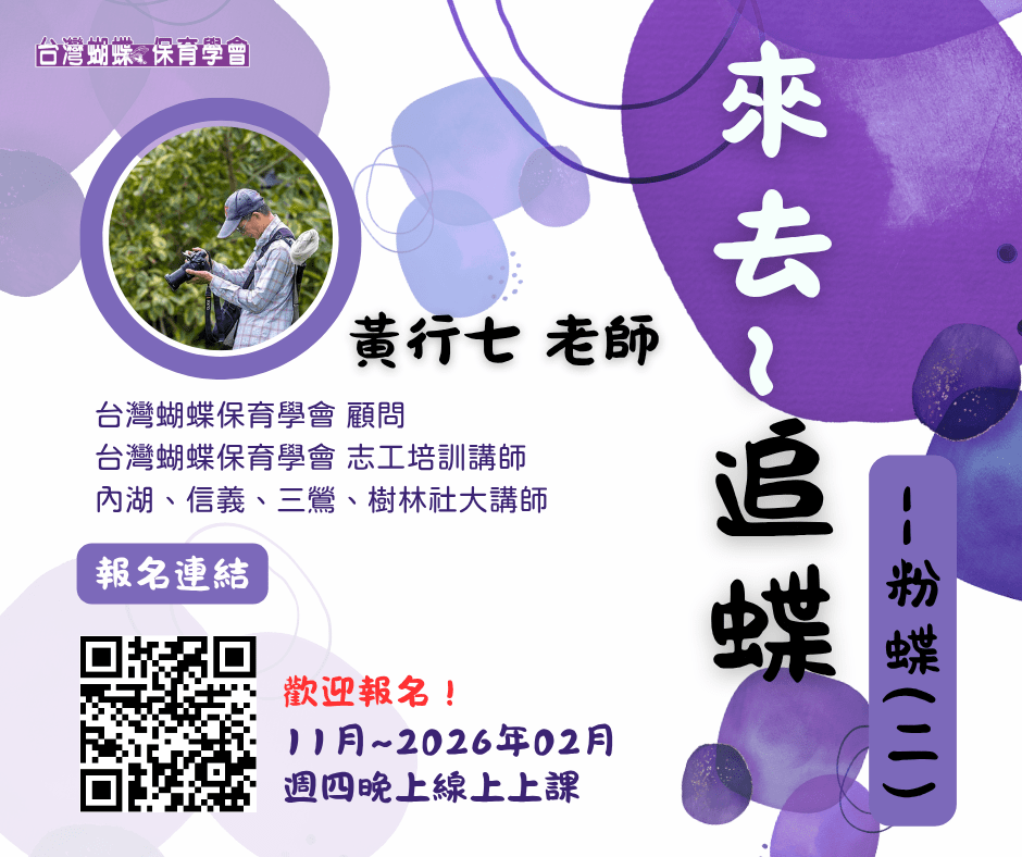 後疫情時代蝶會開啟線上專題課程,讓我們跟著關注蝴蝶生態40餘年的黃行七老師進入〈粉蝶〉的世界,一起與蝴蝶作朋友,走在蝴蝶最新資訊中~!