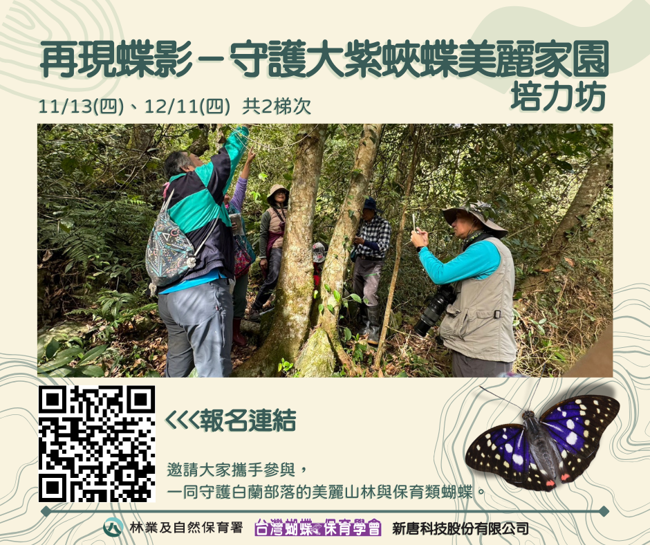 本培力坊以大紫蛺蝶為核心物種,透過企業與社區參與、棲地營造及環境教育,推動森林保護與生態永續。新竹縣五峰鄉白蘭部落是大紫蛺蝶的重要棲息地,亦保存了朴樹等原生植群。為了讓在地居民與關心生態的朋友更加了解大紫蛺蝶與朴樹的生態意義,本次培力坊將以室內課程結合戶外觀察的方式進行培力坊,期望能藉此提升在地保育意識,並邀請各界夥伴攜手參與,守護白蘭部落的山林。