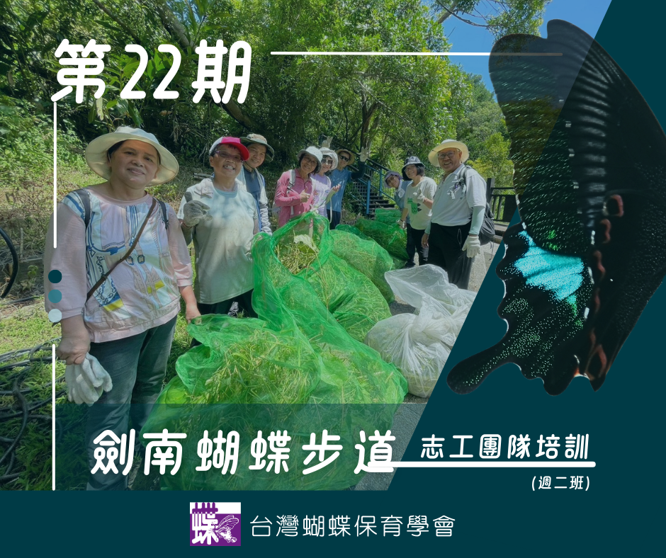 讓每位結訓的志工能於蝴蝶生態導覽解說活動中結合環境教育,傳達蝶會在劍南路及劍南蝶園的棲地經營理念及經驗,同時具備進行區域蝴蝶資源調查、棲地植栽養護、教育推廣、社區營造等工作之能力,並持續施以進階課程之教育訓練。
