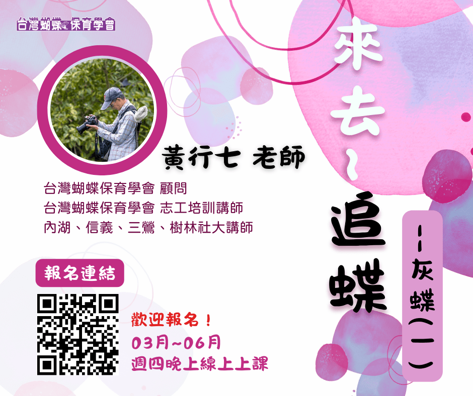 後疫情時代蝶會開啟線上專題課程,讓我們跟著關注蝴蝶生態40餘年的黃行七老師進入〈灰蝶〉的世界,一起與蝴蝶作朋友,走在蝴蝶最新資訊中~!