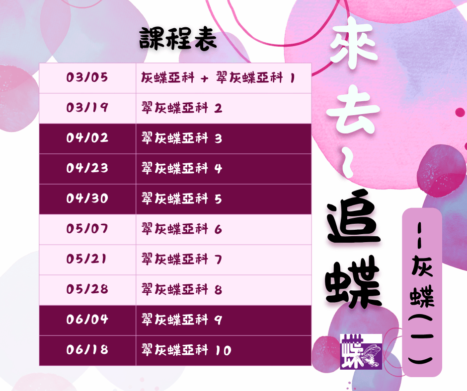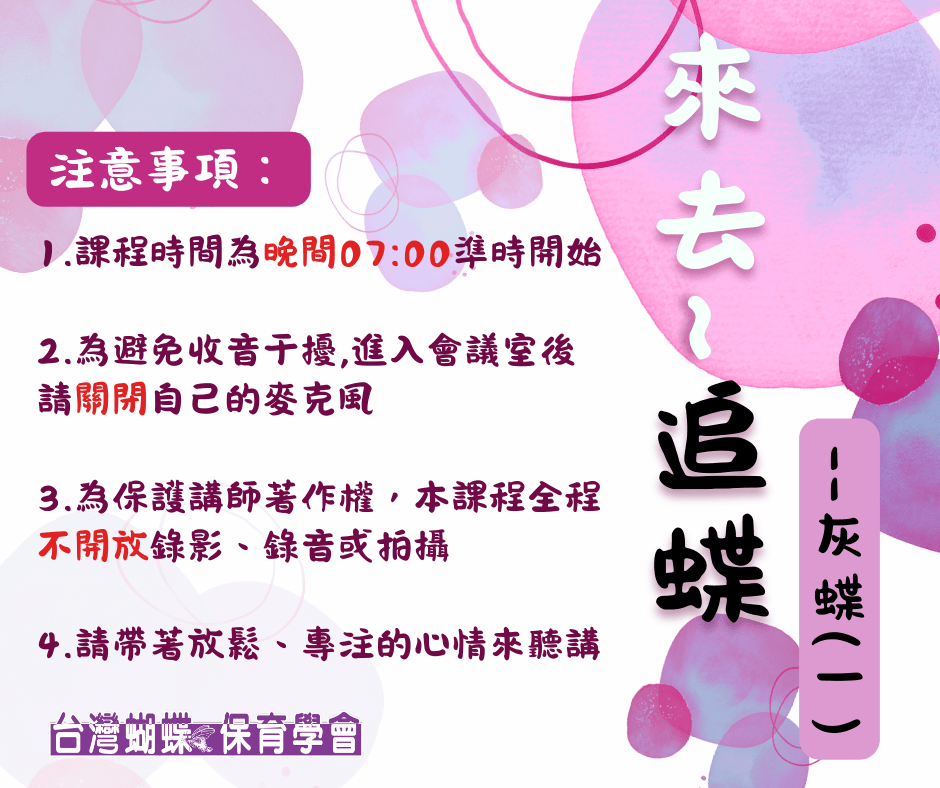 3.台灣蝴蝶保育學會精心規劃之研習課程,除了聘請該領域之專精名師授課,知性、感性與深度兼具外,更重要的意涵是活動盈餘全數轉為推動蝴蝶生態保育工作基金,您的支持蝶會深深感謝。