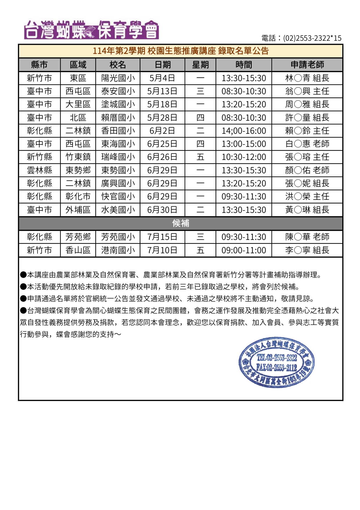 2026校園蝴蝶生態推廣講座(114-2)—申請通過學校 分類:台灣蝴蝶保育學會taiwanbutterfly2026 年 4 月 24 日2026 年 4 月 24 日發表於未分類標籤:最新消息 ※本會提供之2026免費蝴蝶生態推廣講座(114-2)已於04月12日截止申請,本次申請學校共計62所,經抽籤錄取11所正取學校,2所備取學校。 探索更多來自 社團法人台灣蝴蝶保育學會 的內容 訂閱即可透過電子郵件收到最新文章。 輸入你的電子郵件地址… 訂閱 分享此文: 分享到 X(在新視窗中開啟) X 分享到 Facebook(在新視窗中開啟) Facebook 喜歡 正在載入... 相關
