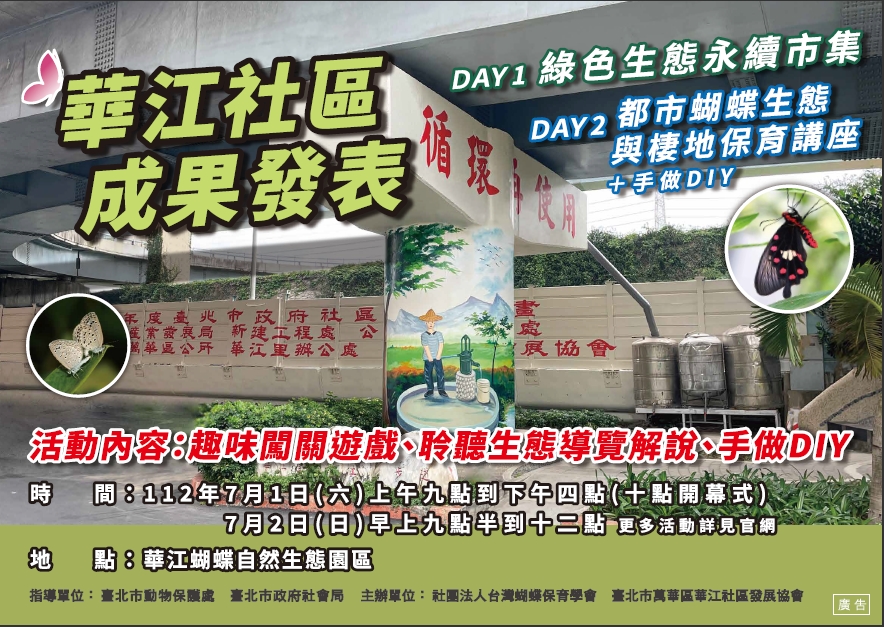 《華江社區成果發表暨暑期活動》 炎炎夏日~暑期小確幸!華江社區將在07/01(六)、07/02(日)舉行綠色生繼續閱讀 “2023|城市蝶旅|綠色市集暨暑期活動"